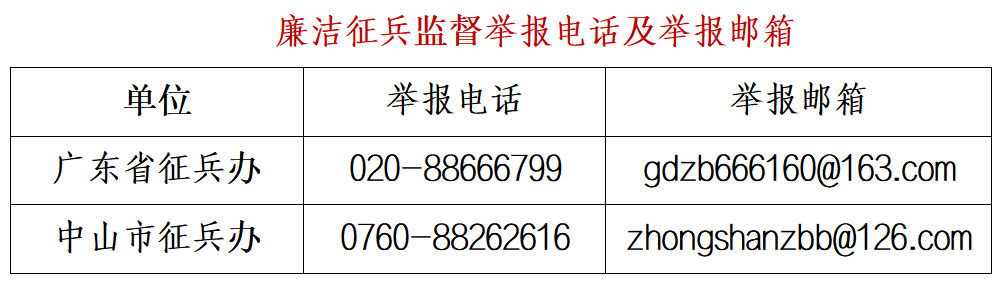 為嚴明兵員征集紀律,筑牢廉潔征兵底線,進一步提升征兵工作透明度,中山市征兵辦將2026年我市廉潔征兵監(jiān)督員名單及監(jiān)督舉報電話、郵箱予以公布。廣大市民若發(fā)現(xiàn)征兵違法違紀線索或廉潔征兵問題,可向廉潔征兵監(jiān)督員反映舉報,也可直接撥打省、市監(jiān)督舉報電話,或發(fā)送郵件至指定信箱反饋。