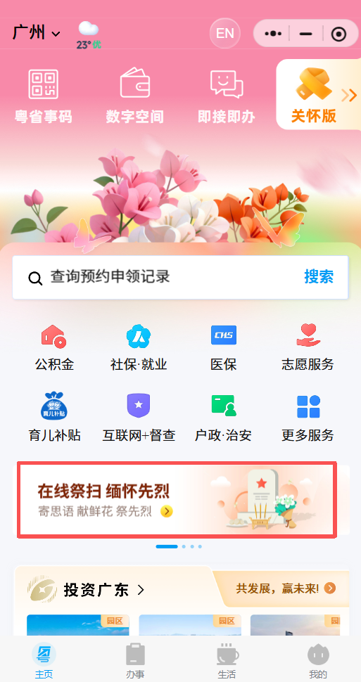 1、進(jìn)入粵省事后,在首頁往下滑動(dòng)至熱門服務(wù)下方的“推廣入口”區(qū)域,然后左右滑動(dòng),可見“在線祭掃 緬懷先烈”的圖片入口。或在搜索欄輸入“英烈在線祭掃”進(jìn)入。