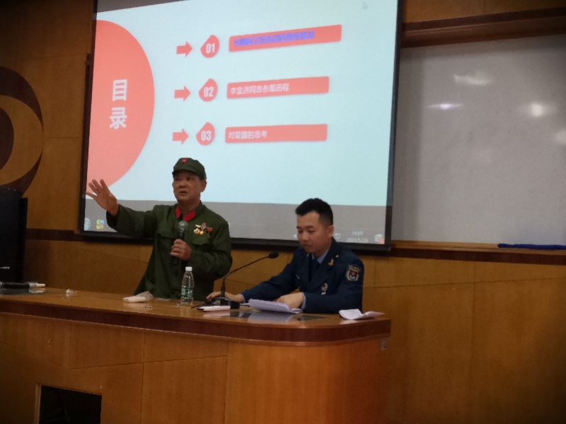 由于身體不適,李金洪無法長時(shí)間親述那段崢嶸歲月,但是這位老兵又是那么熱心地想讓更多后輩知道祖國的不容易,人民當(dāng)今幸福生活的來之不易,毅然接受邀請(qǐng),克服身體不適,再次走上講臺(tái),結(jié)合親身經(jīng)歷給在場師生講述1979年那段崢嶸歲月。李金洪表示,軍人的使命是保衛(wèi)祖國,抵抗侵略,“如果再給我選擇的機(jī)會(huì),我還是義無反顧上戰(zhàn)場,我們有偉大的共產(chǎn)黨、有偉大的制度、有偉大的祖國和人民,我們應(yīng)該為自己是一名中國人和生活在祖國的大地上感到驕傲和自豪”。