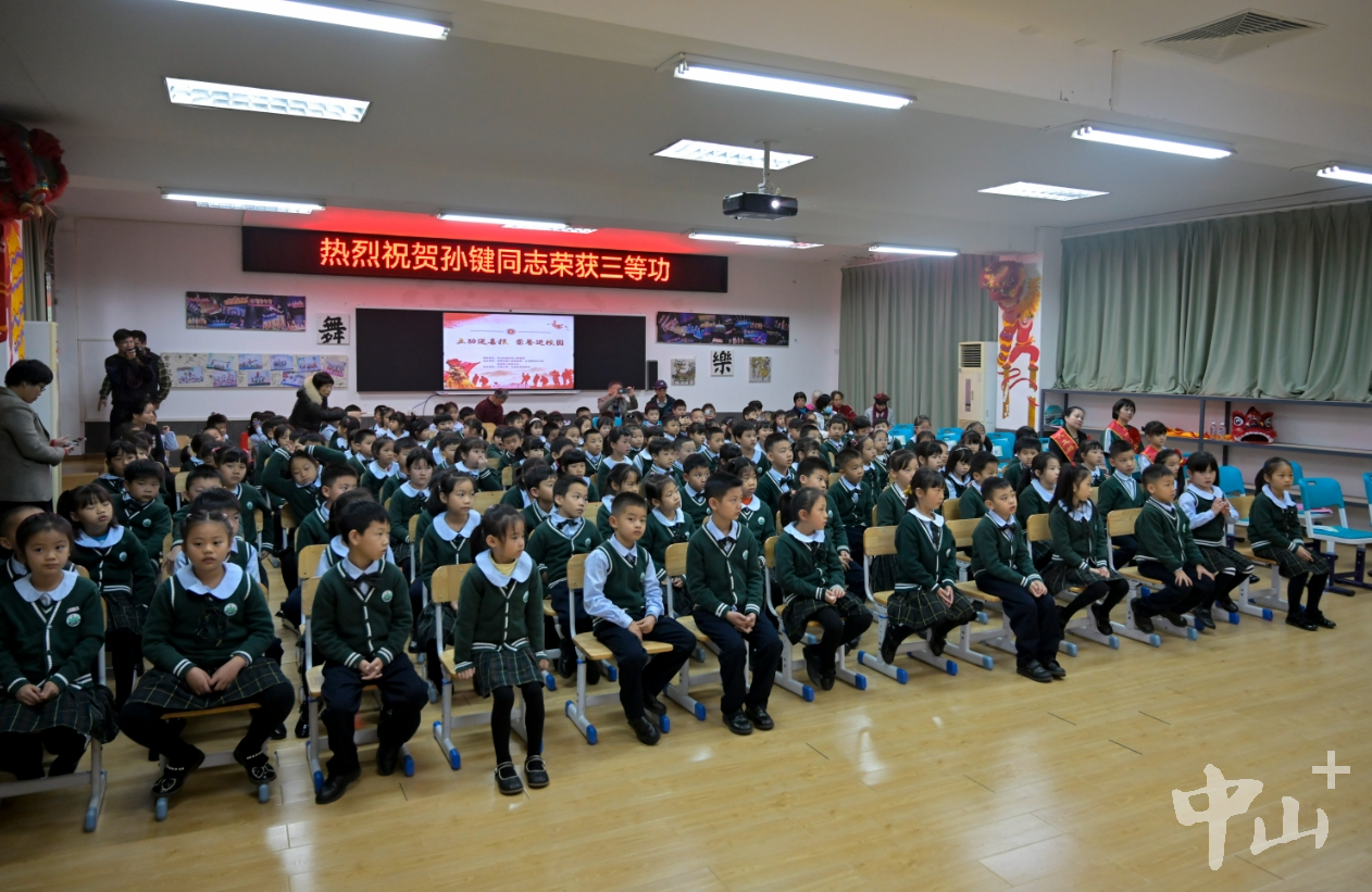 拉橫幅、敲鑼鼓、舞龍獅……2月29日一早,東區(qū)街道竹苑社區(qū)迎來(lái)了一支敲鑼打鼓、舞龍舞獅的隊(duì)伍,一路喜氣洋洋,熱鬧非凡。游行隊(duì)伍將一份立功受獎(jiǎng)的榮譽(yù),帶到了榮立三等功的現(xiàn)役軍人孫鍵女兒孫頌雅所在的竹苑小學(xué),熱鬧的場(chǎng)面吸引許多鄉(xiāng)親、商戶(hù)等前來(lái)圍觀祝賀。 聯(lián)合送喜報(bào),儀式感拉滿(mǎn) 校園內(nèi),在讀小學(xué)一年級(jí)的“軍娃”孫頌雅和她的同學(xué)、老師等共同見(jiàn)證了這一榮耀時(shí)刻。東區(qū)街道黨工委書(shū)記周俊峰將三等功喜報(bào)送到孫頌雅一家人手上,市退役軍人事務(wù)局黨組成員、副局長(zhǎng)陳光林為他們送上慰問(wèn)金,并為其佩戴光榮綬帶“一人立功,全家光榮”,一家人臉上洋溢著開(kāi)心且自豪的笑容。  孫頌雅一家人在學(xué)校收到立功喜報(bào)。記者 易承樂(lè) 攝