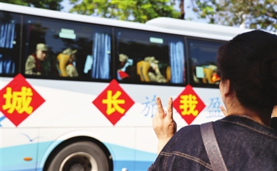 ▲家屬比劃勝利手勢(shì),為新兵加油。記者 文波 攝