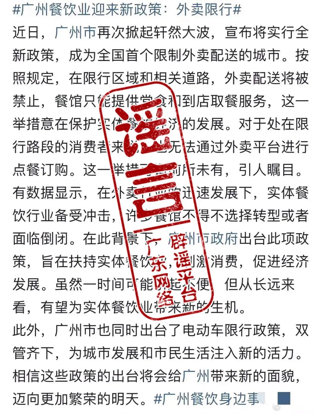 近日,有自媒體發(fā)布“廣州市將實(shí)行全新政策,成為全國(guó)首個(gè)限制外賣(mài)配送的城市”“限行區(qū)域和相關(guān)道路,外賣(mài)配送將被禁止,餐館只能提供堂食和到店取餐服務(wù)”,經(jīng)核查,上述信息嚴(yán)重不實(shí),惡意曲解廣州電動(dòng)自行車(chē)限行新規(guī),誤導(dǎo)民眾,引發(fā)不良社會(huì)影響。