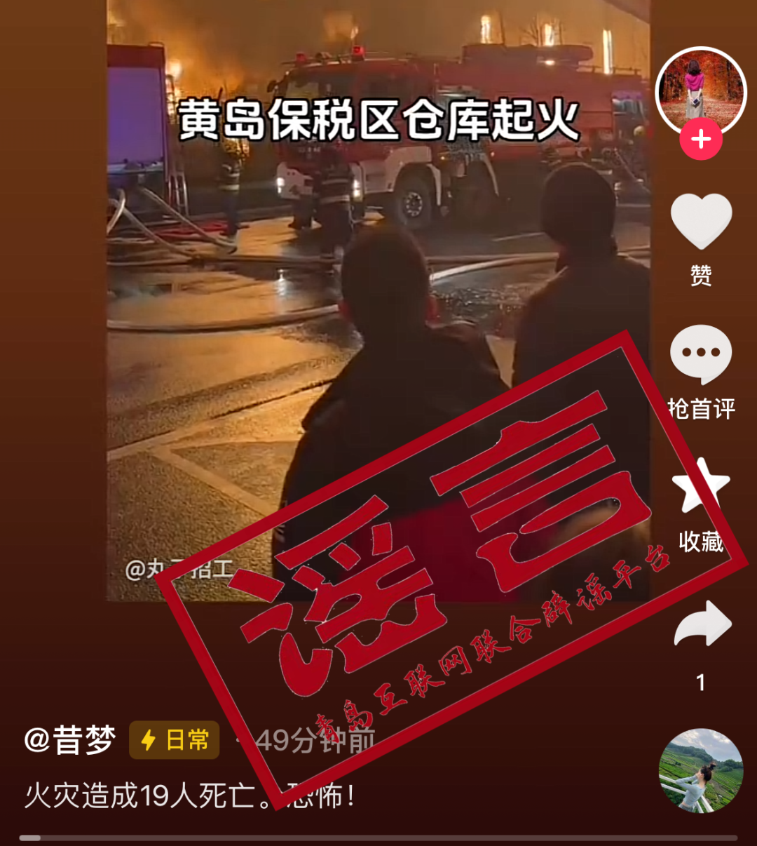 有網(wǎng)民在社交平臺(tái)發(fā)布青島火災(zāi)相關(guān)視頻,并配以“火災(zāi)造成19人死亡”“恐怖”等文字,此系謠言!