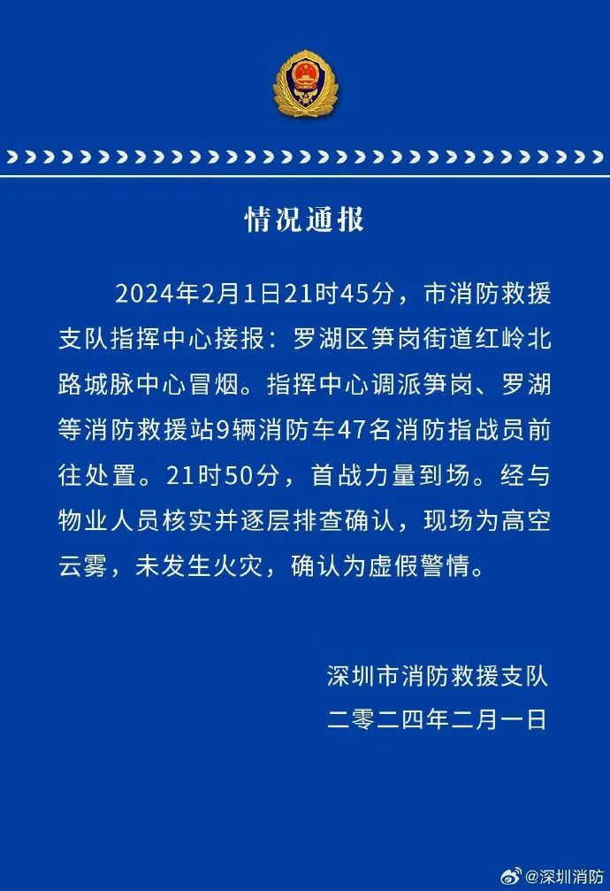 深圳市消防救援支隊指揮中心調(diào)派筍崗、羅湖等消防救援站9輛消防車47名消防指戰(zhàn)員前往處置。21時50分,首戰(zhàn)力量到場。經(jīng)與物業(yè)人員核實并逐層排查確認,現(xiàn)場為高空云霧,未發(fā)生火災,確認為虛假警情。