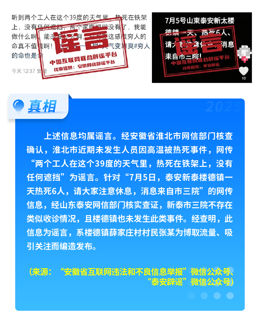 近期,網(wǎng)上接連出現(xiàn)發(fā)布虛假“警情通報(bào)”的惡性造謠傳謠案件,炮制傳播“昆明駕車撞人案131人死亡”“杭州自來(lái)水接入糞水”及涉釋永信虛假“警情通報(bào)”,模仿“藍(lán)底白字”格式,杜撰聳人聽(tīng)聞細(xì)節(jié),損害政府公信力,嚴(yán)重?cái)_亂社會(huì)秩序?!霸菏款A(yù)測(cè)廣東將發(fā)生8級(jí)以上大地震”公然偽造專家聊天截圖,謊報(bào)地震預(yù)警。還有造謠者借盛夏高溫酷暑與洪澇災(zāi)害,編造“安徽淮北、山東泰安等地多人因高溫死亡” “重慶大暴雨導(dǎo)致15人死亡、4人失蹤”等謠言,蹭炒熱點(diǎn)、煽動(dòng)情緒。