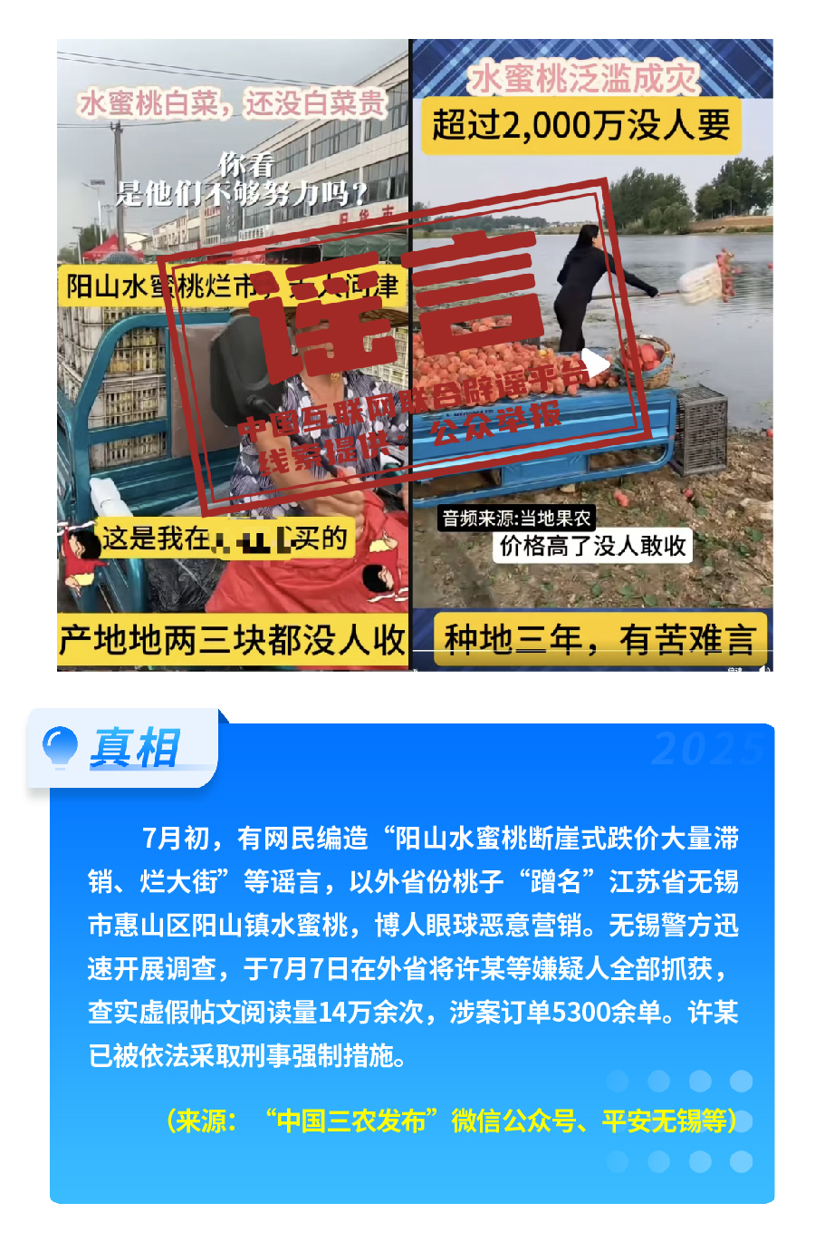 此外,7月份正值暑期旅游旺季和水果等農(nóng)產(chǎn)品收獲季,有自媒體、商家借機(jī)編造傳播涉文旅及農(nóng)產(chǎn)類謠言,干擾市場(chǎng)秩序,侵害消費(fèi)者權(quán)益。有商家違規(guī)使用人民大會(huì)堂建筑圖片標(biāo)識(shí)和名稱,仿冒人民大會(huì)堂賬號(hào),非法售賣、倒賣參觀門票,損害游客權(quán)益。個(gè)別商家剪輯發(fā)布“江蘇無(wú)錫陽(yáng)山水蜜桃斷崖式跌價(jià)、大量滯銷、爛大街”謠言視頻,再借機(jī)兜售假冒的陽(yáng)山水蜜桃,博人眼球惡意營(yíng)銷,擾亂市場(chǎng)秩序。所謂“峨眉山人猴大戰(zhàn),游客墜崖,猴王被當(dāng)場(chǎng)擊斃”景區(qū)安全事件一度傳得沸沸揚(yáng)揚(yáng),相關(guān)視頻以驚悚情節(jié)博取關(guān)注,畫面實(shí)際是用AI合成拼接制作。