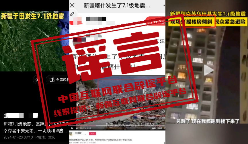 詳情:1月23日2時9分,新疆阿克蘇地區(qū)烏什縣發(fā)生7.1級地震。隨后,關(guān)于此次地震的各種不實(shí)信息在網(wǎng)絡(luò)上傳播,混淆視聽、引發(fā)關(guān)注。針對“新疆喀什發(fā)生7.1級地震”“新疆和田地區(qū)于田縣發(fā)生7.1級地震”的網(wǎng)傳信息,經(jīng)喀什市應(yīng)急管理局和于田縣應(yīng)急管理局證實(shí),1月23日兩地均未發(fā)生地震,信息為虛假不實(shí)內(nèi)容;針對“阿克蘇某小區(qū)樓被地震晃歪了”的圖文信息,經(jīng)相關(guān)部門核實(shí),圖片中的建筑物為阿克蘇市鳳凰城小區(qū)居民樓,排查暫未發(fā)現(xiàn)地震造成該樓體傾斜,網(wǎng)傳圖片系建筑物樓體設(shè)計(jì)和拍攝角度造成的樓體傾斜視覺錯誤;針對上述圖片和視頻顯示的“烏什縣路面損毀嚴(yán)重、房屋連片倒塌”相關(guān)信息,經(jīng)查是網(wǎng)民利用AI自動生成技術(shù),將烏什縣7.1級地震有關(guān)信息與網(wǎng)絡(luò)舊圖合成的虛假信息。中國互聯(lián)網(wǎng)聯(lián)合辟謠平臺提醒廣大網(wǎng)民,以官方發(fā)布信息為準(zhǔn),自覺抵制網(wǎng)絡(luò)謠言。(來源:“和田網(wǎng)絡(luò)舉報(bào)辟謠”微信公眾號、“喀什市零距離”微信公眾號、“阿克蘇網(wǎng)絡(luò)舉報(bào)”微信公眾號)