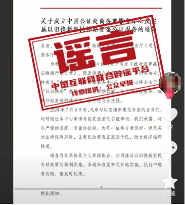 辟 謠 商務部發(fā)布聲明:從未發(fā)布《關于以舊換新惠民款補貼發(fā)放的公證通知》