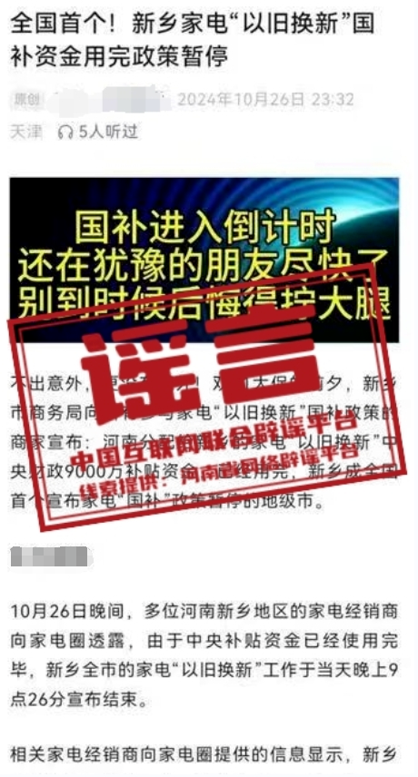 謠 言 河南新鄉(xiāng)家電“以舊換新”國(guó)家補(bǔ)貼資金用完、政策暫停?