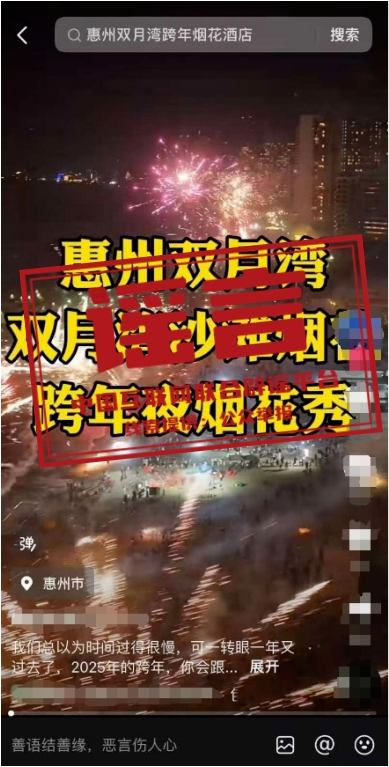 真相:近期,網(wǎng)絡上出現(xiàn) “廣東惠州雙月灣2025跨年煙花秀”“2025雙月灣跨年倒數(shù)夜”“雙月灣跨年煙花秀”等信息,引發(fā)關注。經(jīng)相關部門核實,網(wǎng)傳信息均系不實信息。目前廣東省惠州市惠東縣雙月灣沒有舉辦2025年跨年煙花秀活動的安排,請廣大游客不聽謠、不信謠、不傳謠,一切以官方發(fā)布信息為準。(來源:“惠州日報”微信公眾號、惠東文旅體)