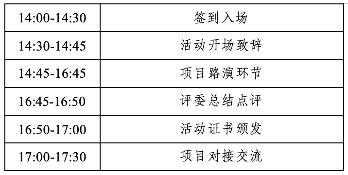 (五)活動(dòng)形式:采用線(xiàn)下路演模式,每個(gè)項(xiàng)目路演時(shí)長(zhǎng)20分鐘以?xún)?nèi)(含15分鐘項(xiàng)目展示+5分鐘評(píng)委提問(wèn)環(huán)節(jié))。